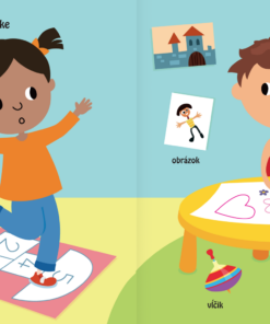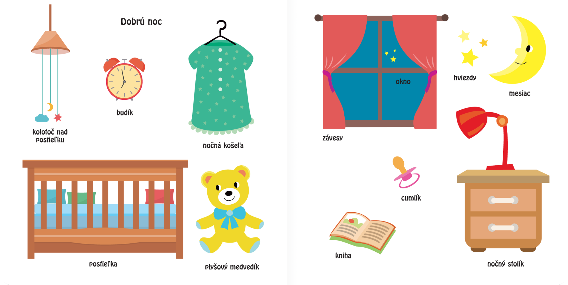 Prezrite si spolu s vašim batoľaťom stránky plné vecí, čo deti bežne poznajú zo sveta okolo seba. Sú to napríklad činnosti, predmety v dome, oblečenie, riad z kuchyne, drobní tvorovia na záhrade, hračky v izbičke, dopravné prostriedky i veci, ktoré nás sprevádzajú na spánok, či už v kúpeľni alebo v spálni. Vaše dieťa sa pritom bude učiť názvy všetkých týchto javov a rozvíjať svoju reč. Zároveň si precvičí aj zmysel pre pozorovanie. Roztomilé ilustrácie zaujmú i pobavia.