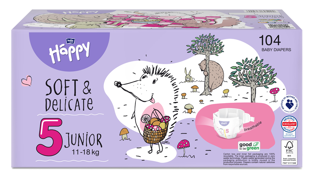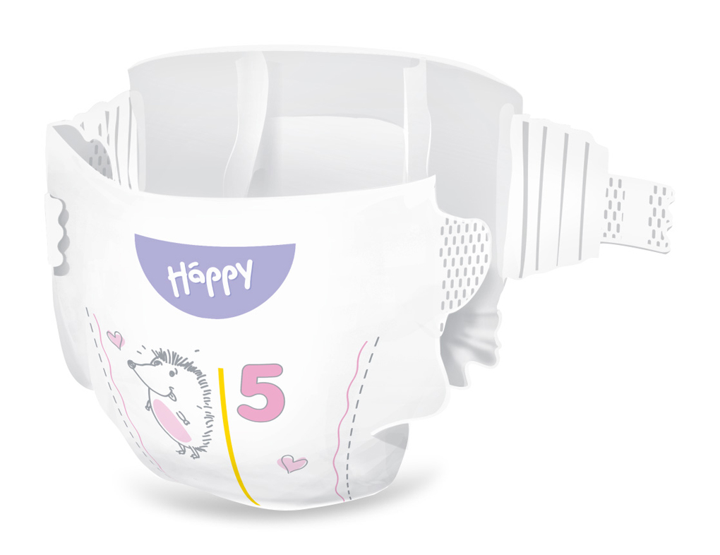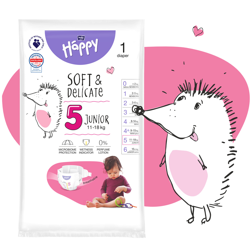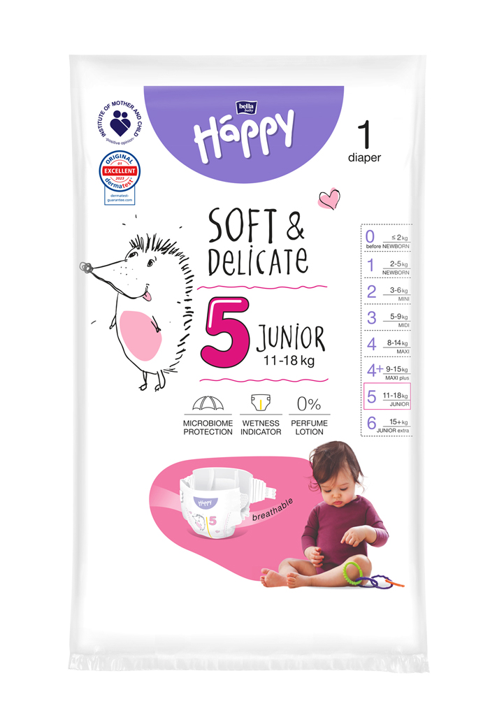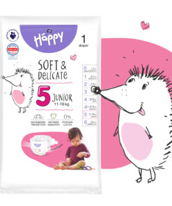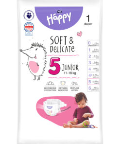 Detské plienky Happy Soft & Delicate Junior (5) sú odporúčané pre novorodencov s hmotnosťou 15 a viac kilogramov. Sú vyrobené z najkvalitnejších materiálov, dokonale sa prispôsobia telu dieťatka a poskytujú príjemný pocit sucha. Sú navrhnuté tak, aby vyhovovali potrebám tej najcitlivejšej pokožky – neobsahujú žiadne alergény a minimalizujú riziko vzniku zaparenín.