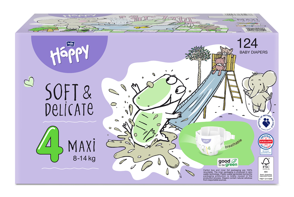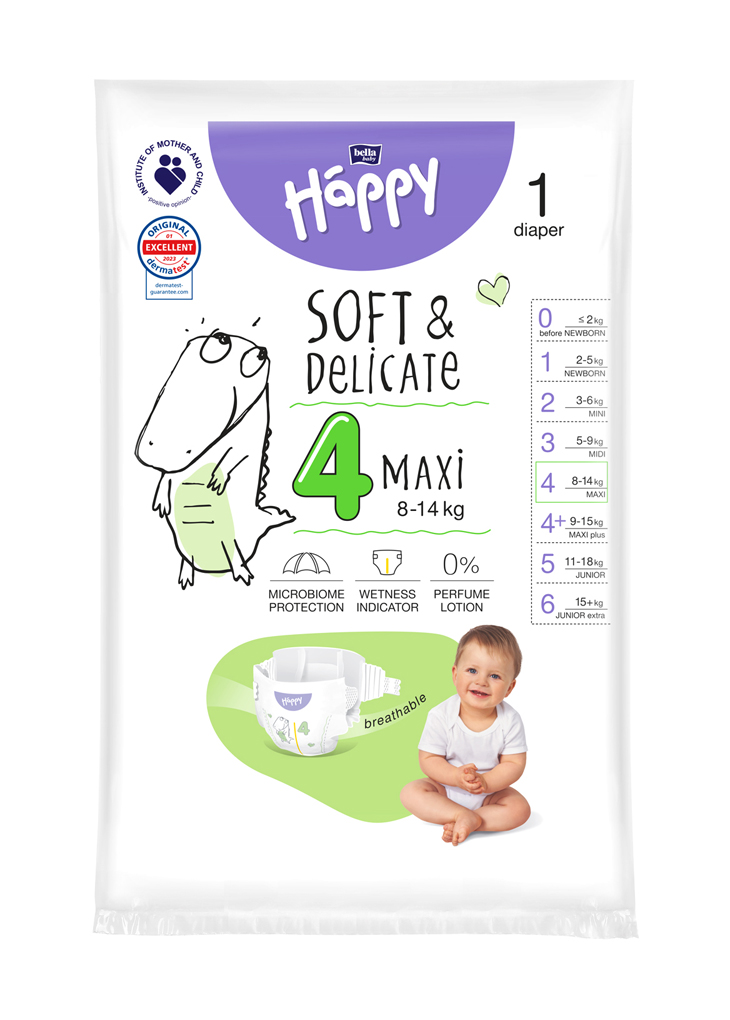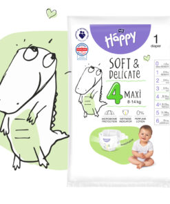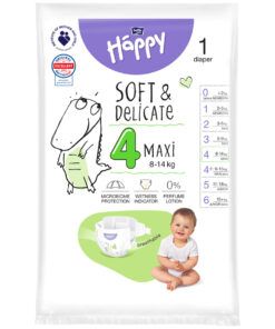 Detské plienky Happy Soft & Delicate Maxi (4) sú odporúčané pre novorodencov s hmotnosťou 8-14 kg. Sú vyrobené z najkvalitnejších materiálov, dokonale sa prispôsobia telu dieťatka a poskytujú príjemný pocit sucha. Sú navrhnuté tak, aby vyhovovali potrebám tej najcitlivejšej pokožky – neobsahujú žiadne alergény a minimalizujú riziko vzniku zaparenín.