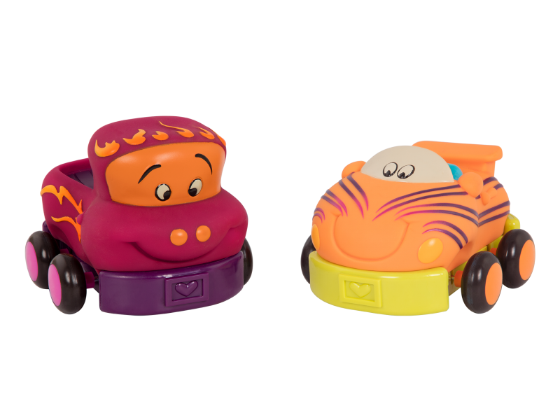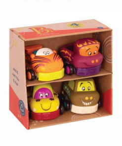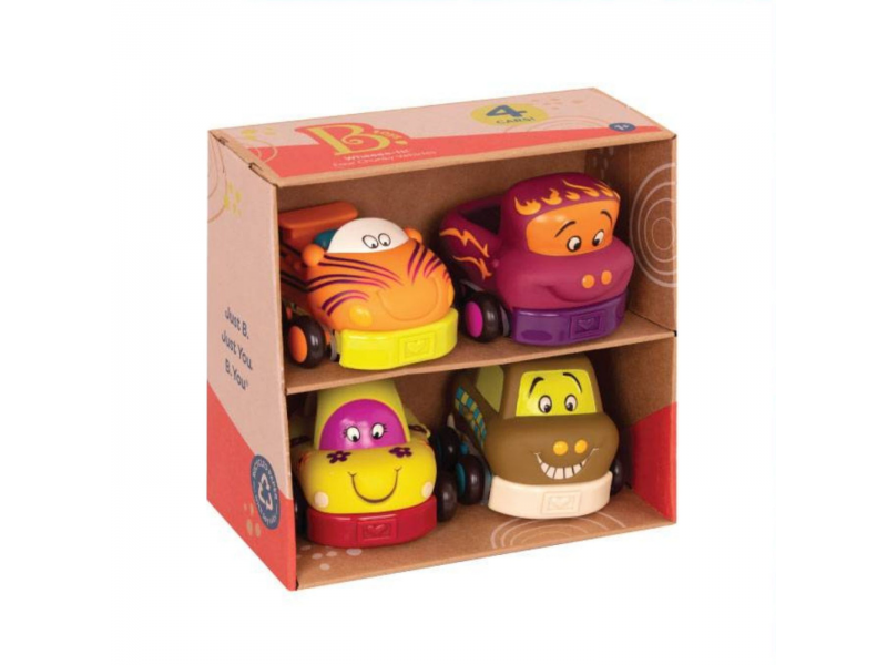 Štyri mäkké plastové autíčka Wheee-ls! sú ideálne pre najmenších milovníkov áut. Autíčka na zotrvačník po natiahnutí dozadu samé pôjdu dopredu. Po stlačení osobné auto zvoní, nákladiak cinká, pretekárske auto hrká a taxík píska.