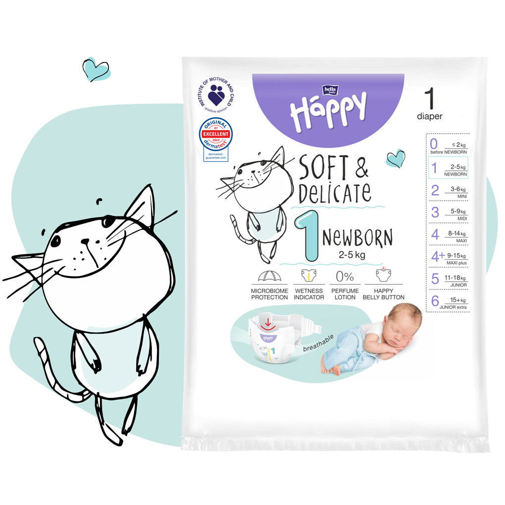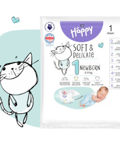 Detské plienky Happy Soft & Delicate Newborn (1) sú odporúčané pre novorodenca s hmotnosťou 2-5 kg. Sú vyrobené z najkvalitnejších materiálov, dokonale sa prispôsobia telu dieťatka a poskytujú príjemný pocit sucha. Sú navrhnuté tak, aby vyhovovali potrebám tej najcitlivejšej pokožky – neobsahujú žiadne alergény a minimalizujú riziko vzniku zaparenín.Novorodenecké plienky (veľkosti 0 a 1) majú v prednej časti špeciálny výrez na pupok, ktorý zaisťuje prístup vzduchu k pahýliku pupočníka, a urýchľuje tak proces hojenia.