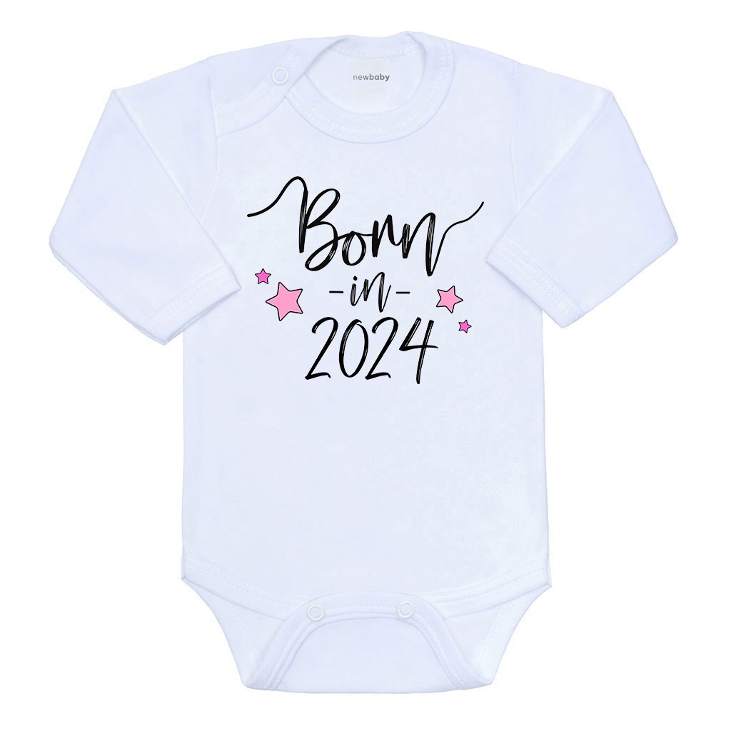Originálne bavlnené dojčenské body s dlhým rukávom New Baby s nápisom Born in 2024. Farby použité k potlači sú certifikované a vhodné pre bábätká. Je vyrobené z príjemného a kvalitného materiálu, v ktorom sa bude Vaše bábätko cítiť príjemne. Body má zapínanie na cvočky na ramienku a medzi nožičkami, čo uľahčuje obliekanie a prebaľovanie. Doprajte Vášmu bábätku vyniknúť v originálnom body. Zloženie: 100% bavlna.