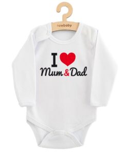 Originálne bavlnené dojčenské body s dlhým rukávom New Baby, s vtipným nápisom I Love Mum and Dad. Farby použité k potlači sú certifikované a vhodné pre bábätká. Je vyrobené z príjemného a kvalitného materiálu, v ktorom sa bude Vaše bábätko cítiť príjemne. Body má zapínanie na cvočky na ramienku a medzi nožičkami, čo uľahčuje obliekanie a prebaľovanie. Doprajte Vášmu bábätku vyniknúť v originálnom body. Zloženie: 100% bavlna. Rozmery: obvod okolo hrudníka cca 42 cm, dĺžka rukáva cca 23 cm, celková dĺžka cca 38 cm.