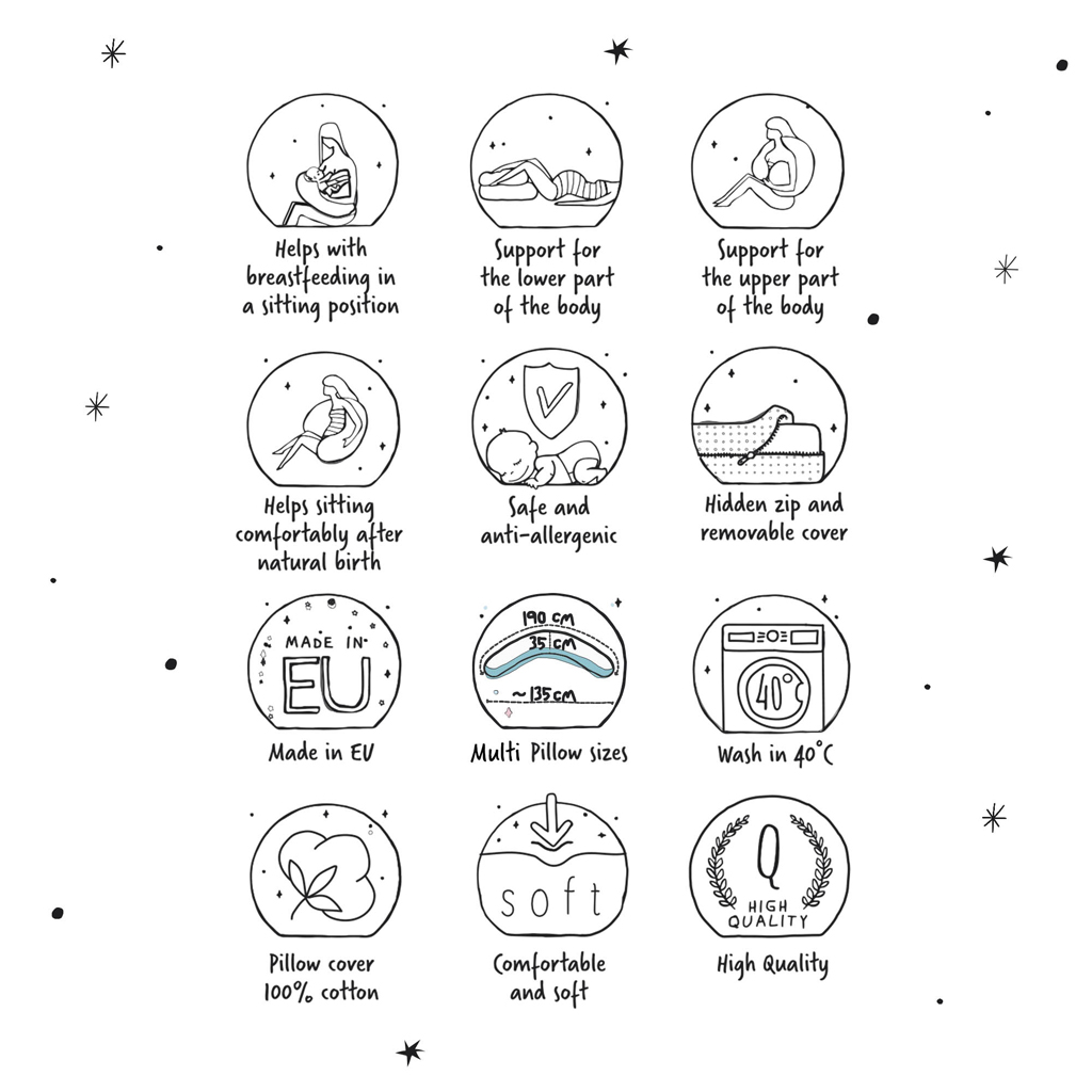 Dôležité: Pred každým použitím vždy skontrolujte stav vankúša, aby ste zaistili maximálnu bezpečnosť a pohodlie pre vás a vaše dieťa.