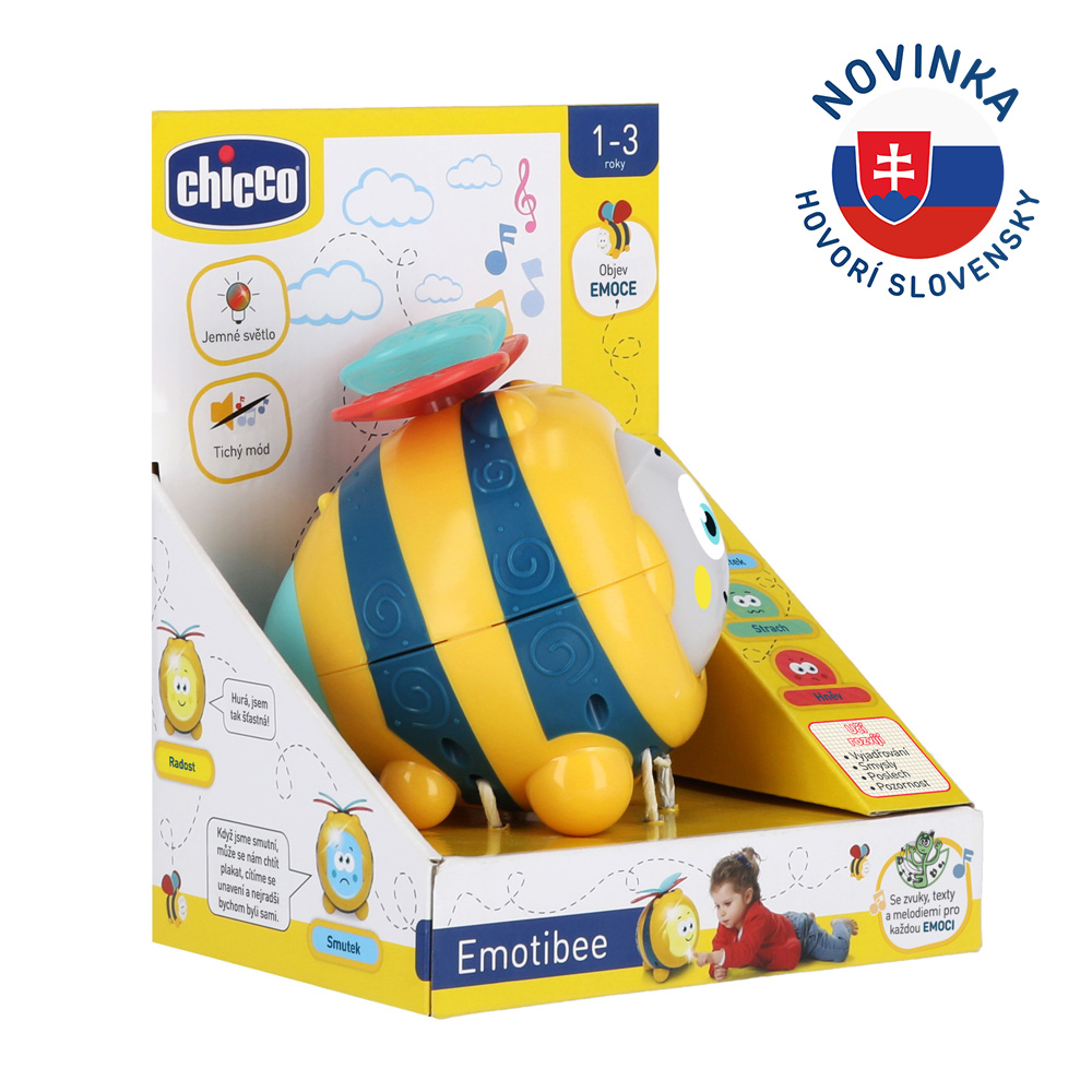 Otočením tváre včielky sa zmení na jednu zo štyroch emócii: radosť, strach, hnev alebo smútok. Každá emócia je spojená s výrazom tváre, farbou, zvukmi a melódiami, čím sa dieťatko učí spoznávať vlastnú emóciu, vyrovnať sa s ňou a pomenovať ako sa cíti.