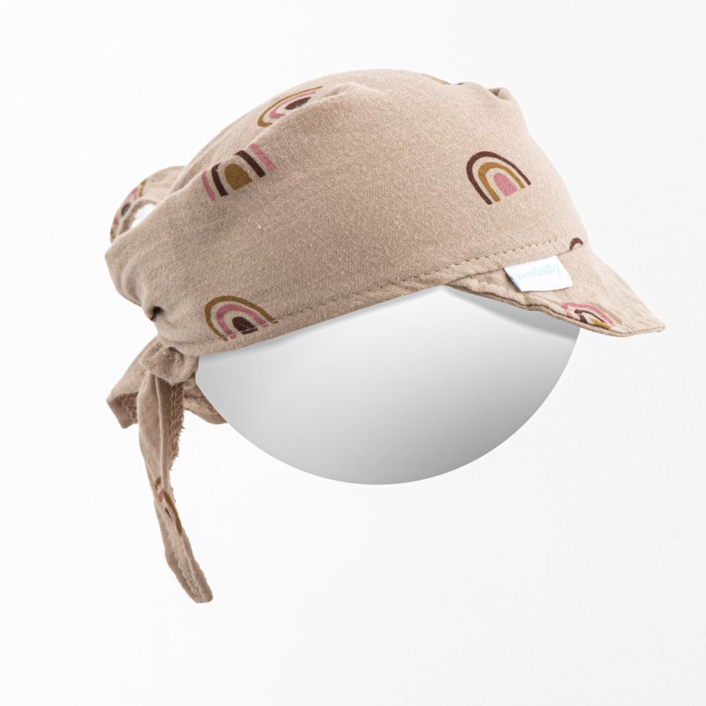 Letná mušelínová šatka so šiltom New Baby Rainbow celopotlačená krásnymi dúhami. Šatka ochráni hlavičku pred prudkým slnkom a vďaka šiltu, ktorý urobí tieň nespáli tváričku a chráni oči dieťaťa pred slnkom.