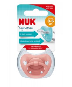 Dojčenský cumlík NUK Signature 0-6 mesiacov. Cumlík má krásny farebný obrázok. Ortodontický tvar podporuje vývoj celej ústnej dutiny dieťaťa. Cumlík je vylepšený a má ešte plochejší tvar. Tenký a úzky krčok cumlíka – znižuje tlak na čeľusť a zúbky. Je vyrobený z vysoko kvalitného plastu a silikónového cumlíka. Náustní kryt a krúžok sú vyrobené z polypropylénu a neobsahujú BPA. Výhodou silikónu je to, že je bez zápachu a ľahko sa čistí. Neobsahuje BPA. Veľkosť 1 (0-6 mesiacov). Všetky NUK cumlíky sú pravidelne testované a sledované nezávislými inštitútmi. Znovu použiteľná krabička.