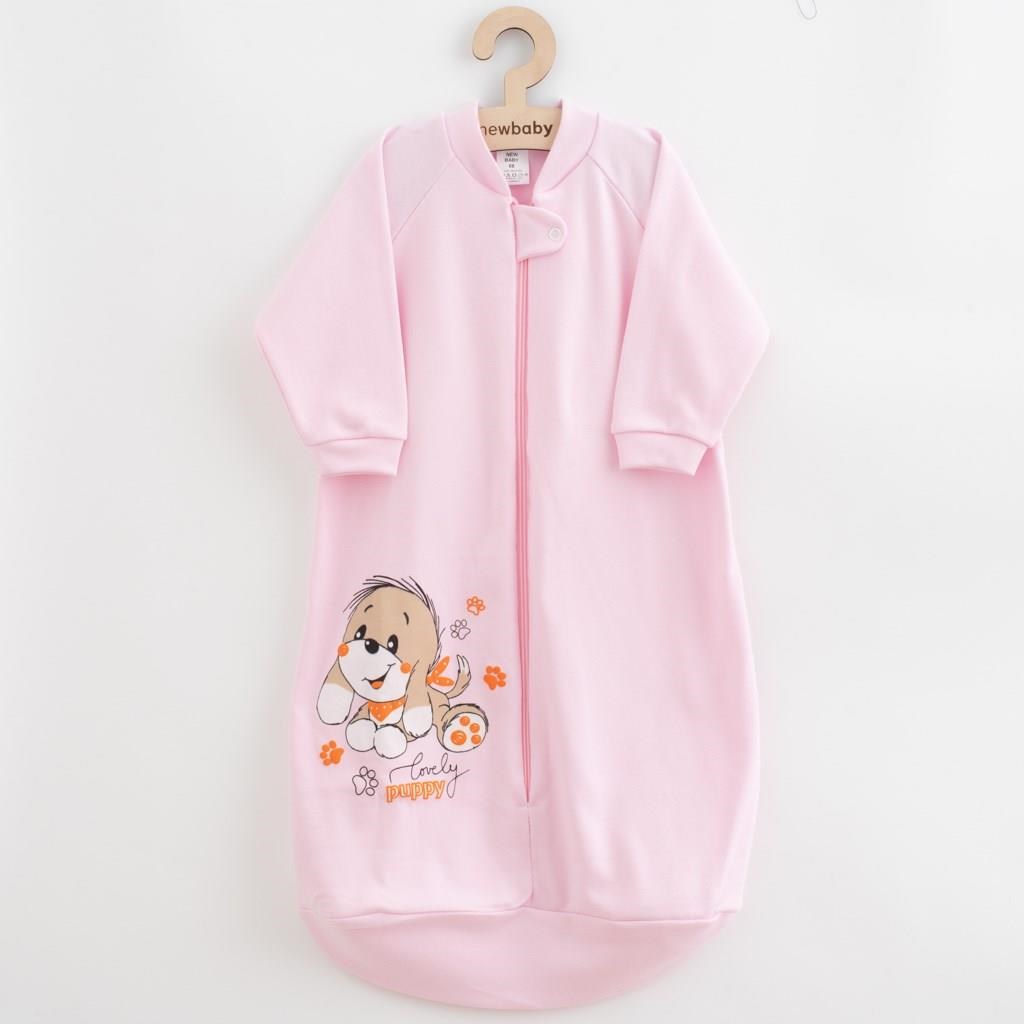 Bavlnený dojčenský spací vak New Baby pre bábätká v krásnej pastelovej farbe s veselým obrázkom psíka. Spací vak je vhodný pre bábätká už od narodenia pre svoju jemnosť a mäkkosť. Praktické zapínanie na zips po celej dĺžke. Zloženie: 100% bavlna.