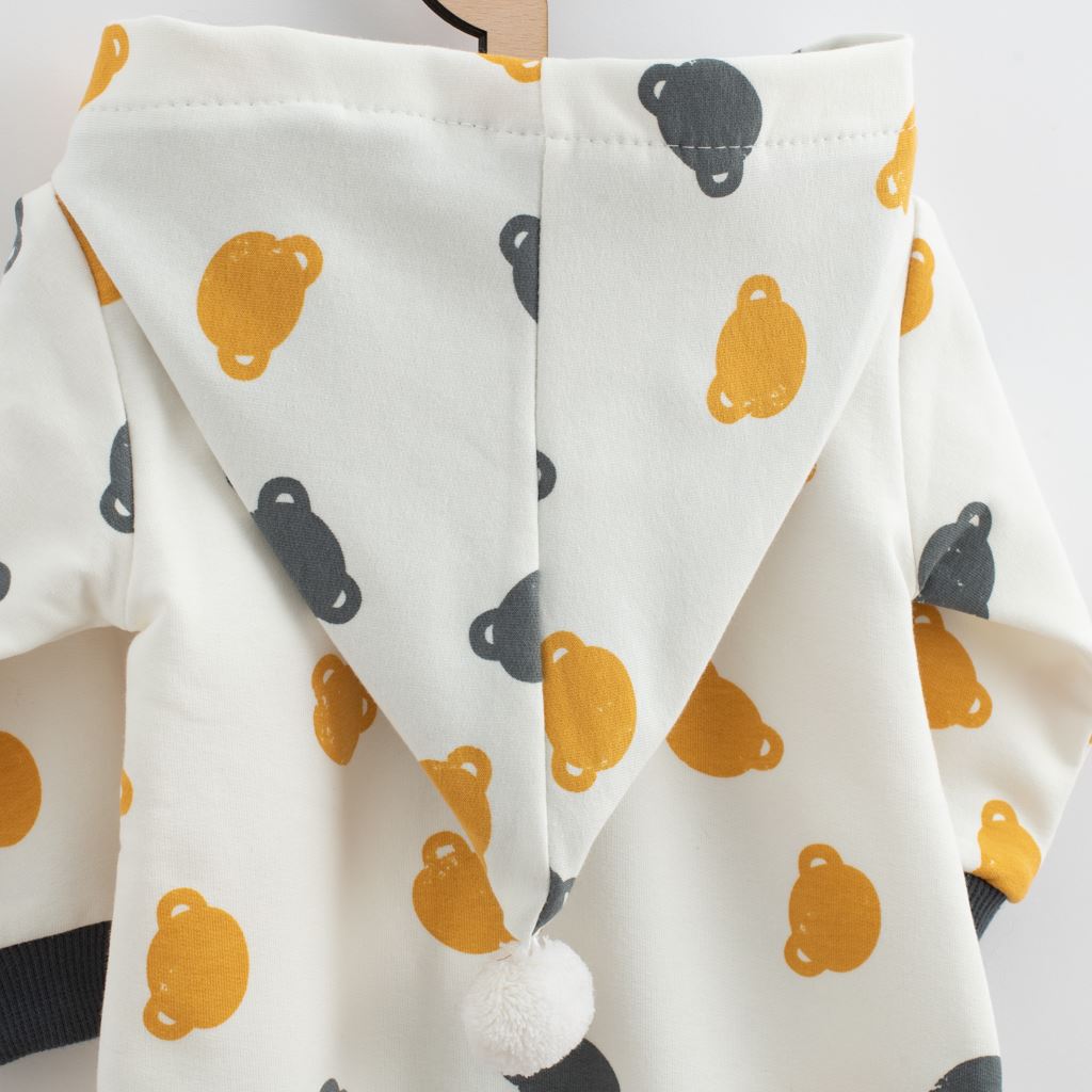 Roztomilý a praktický overal s kapucňou New Baby Little One. Overal je celopotlačený medvedíkmi, má zapínanie na zips po celej dĺžke a pružné lemy na rukávoch a nohavičkách. Kapucňa je podšitá farebnou podšívkou a je zdobená roztomilým brmbolcom. Overal je vyrobený z pohodlnej teplákoviny. Vhodný na celoročné nosenie. Materiál: 96% bavlna, 4% elastan.