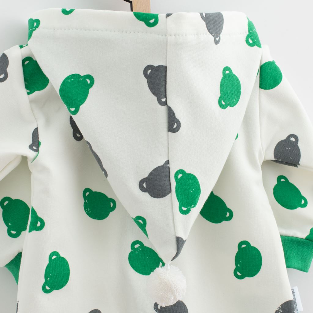 Roztomilý a praktický overal s kapucňou New Baby Little One. Overal je celopotlačený medvedíkmi, má zapínanie na zips po celej dĺžke a pružné lemy na rukávoch a nohavičkách. Kapucňa je podšitá farebnou podšívkou a je zdobená roztomilým brmbolcom. Overal je vyrobený z pohodlnej teplákoviny. Vhodný na celoročné nosenie. Materiál: 96% bavlna, 4% elastan.