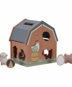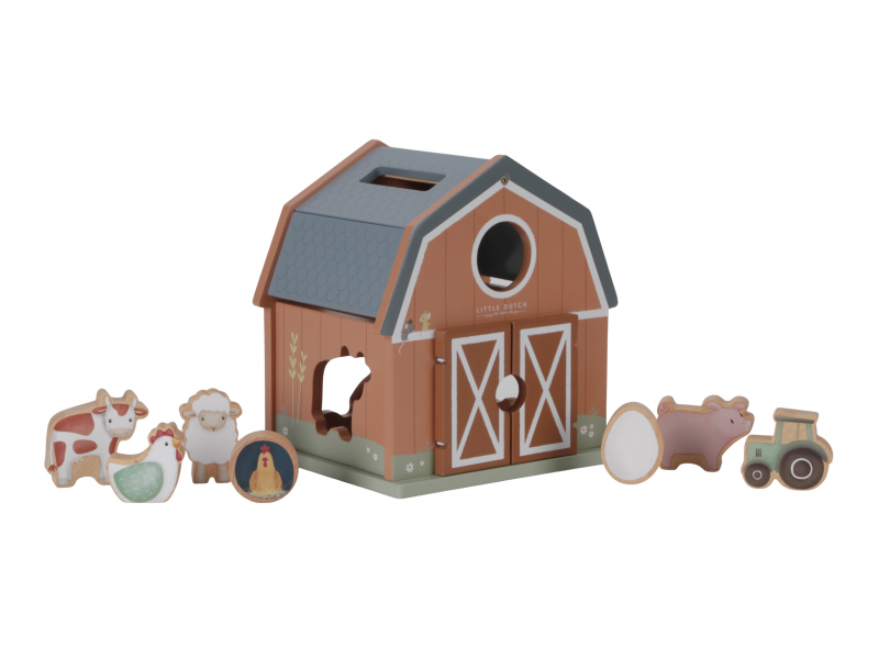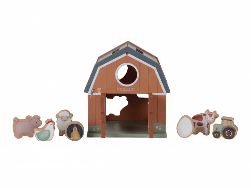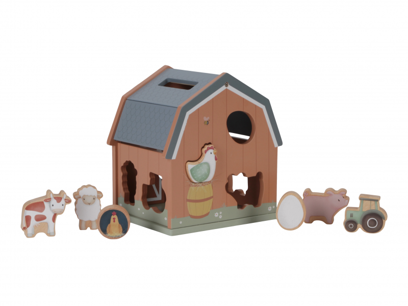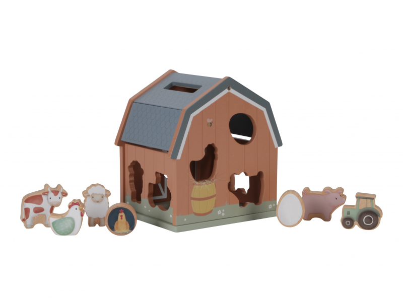 Drevený domček v podobe stodoly pre zvieratká učí deti kreatívnym spôsobom rozpoznávať tvary a zdokonaliť svoju koordináciu rúk a očí. Malé ručičky ľahko uchopia figúrky rôznych tvarov a potom ich zatlačia do správneho otvoru.
