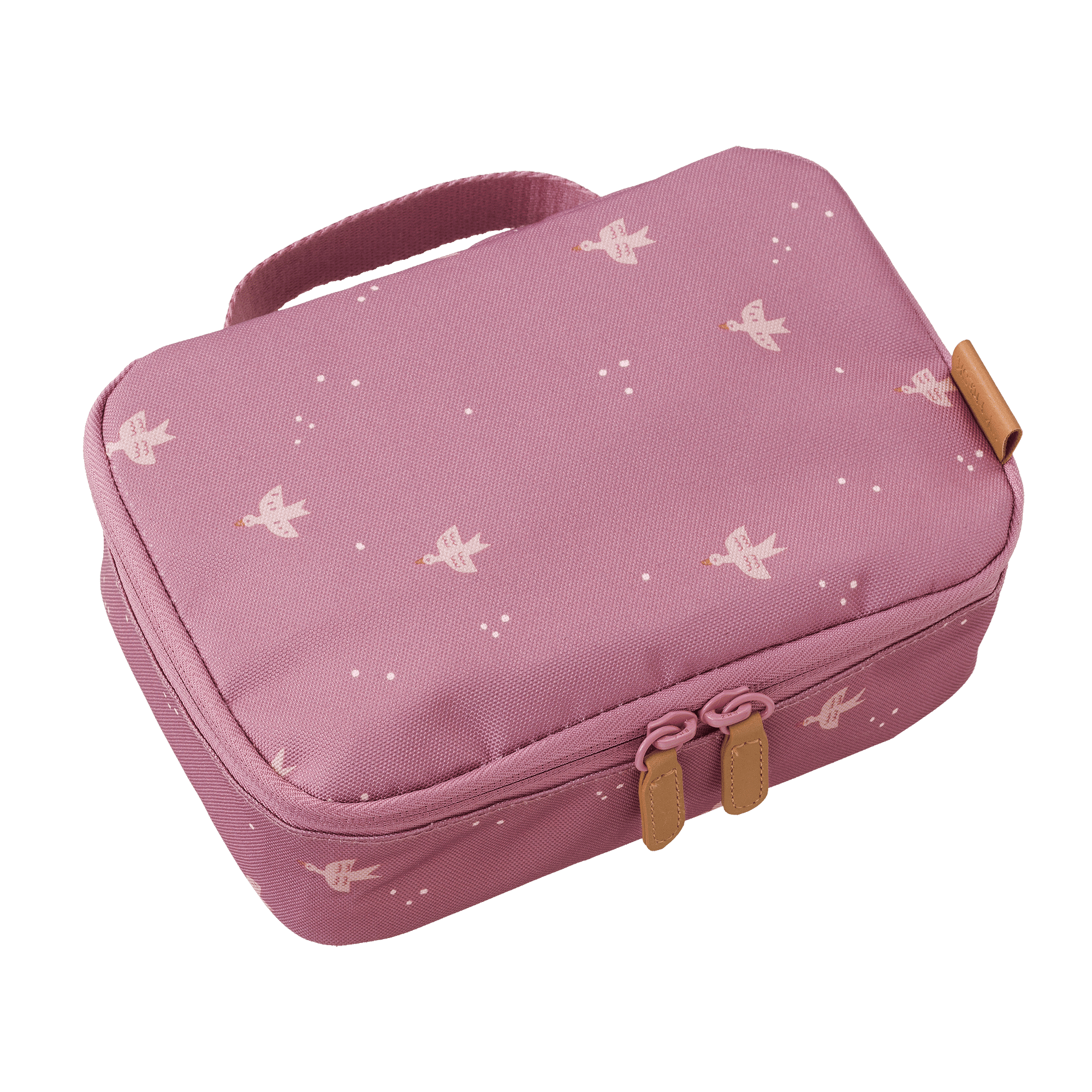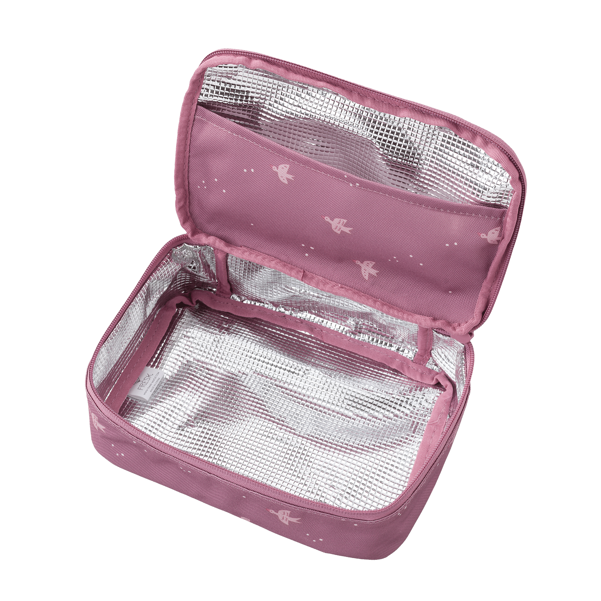 Chladiaca termotaška – obedár so vzorom lastovičiek v ružovej farbe.