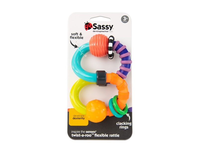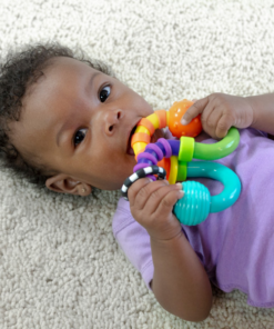Hrkálka vo výrazných, kontrastných farbách ponúka kombináciu pevných a flexibilných častí s rôznymi textúrami a pohyblivými krúžkami na skúmanie. Tvar hrkálky umožňuje ľahké uchopenie malými detskými ručičkami.