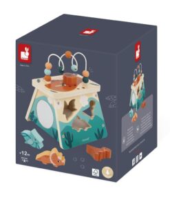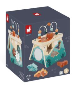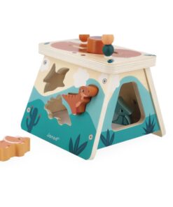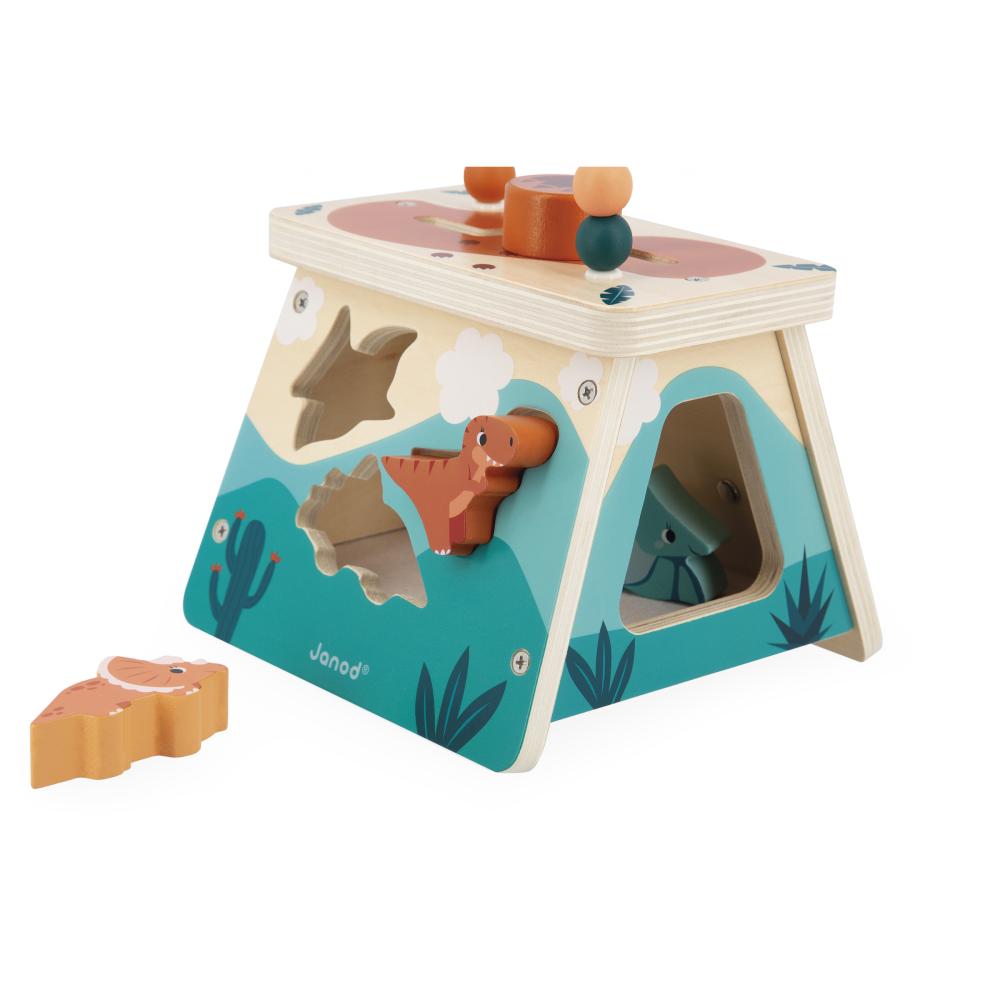 S touto multifunkčnou sopkou zavediete svoje dieťa do sveta dinosaurov. Na prednej strane nájdete možnosť umiestňovať dinosaurov do vyrezaných otvorov. Umiestnite tyranosaura, triceratopsa a pteranodonoma tak, aby sa každý z nich zmestil do zodpovedajúceho tvaru. Dinosaury pri páde nevydávajú žiaden hluk vďaka plsti na dne škatule. Vďaka veľkému otvoru na boku ich bude môcť vaše dieťatko ľahko vybrať. Zadný panel má tri kolieska na otáčanie, na ľavej strane je zrkadlo a navrchu tejto multifunkčnej sopky sa nachádza bludisko a počítadlo s drevenými korálkami. Týchto 5 aktivít pomôže vášmu dieťaťu rozvíjať jemnú motoriku, zručnosť a zvedavosť. Drevená hračka FSC™. Hračka pre skoré učenie pre deti od 12 mesiacov.