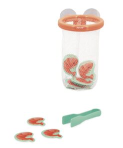 12 malých kreviet uniklo do vane, musíte ich rýchlo chytiť! Pomocou malých klieští môže vaše dieťa chytiť každú krevetu, ktorá pláva na hladine vody, a umiestniť ju do pekného košíka, ktorý sa pomocou prísaviek prichytí na dlaždice. Táto hra umožní vášmu dieťaťu rozvíjať zručnosť a zároveň sa zabaviť vo vani. Hračka do vane pre deti od 2 rokov.