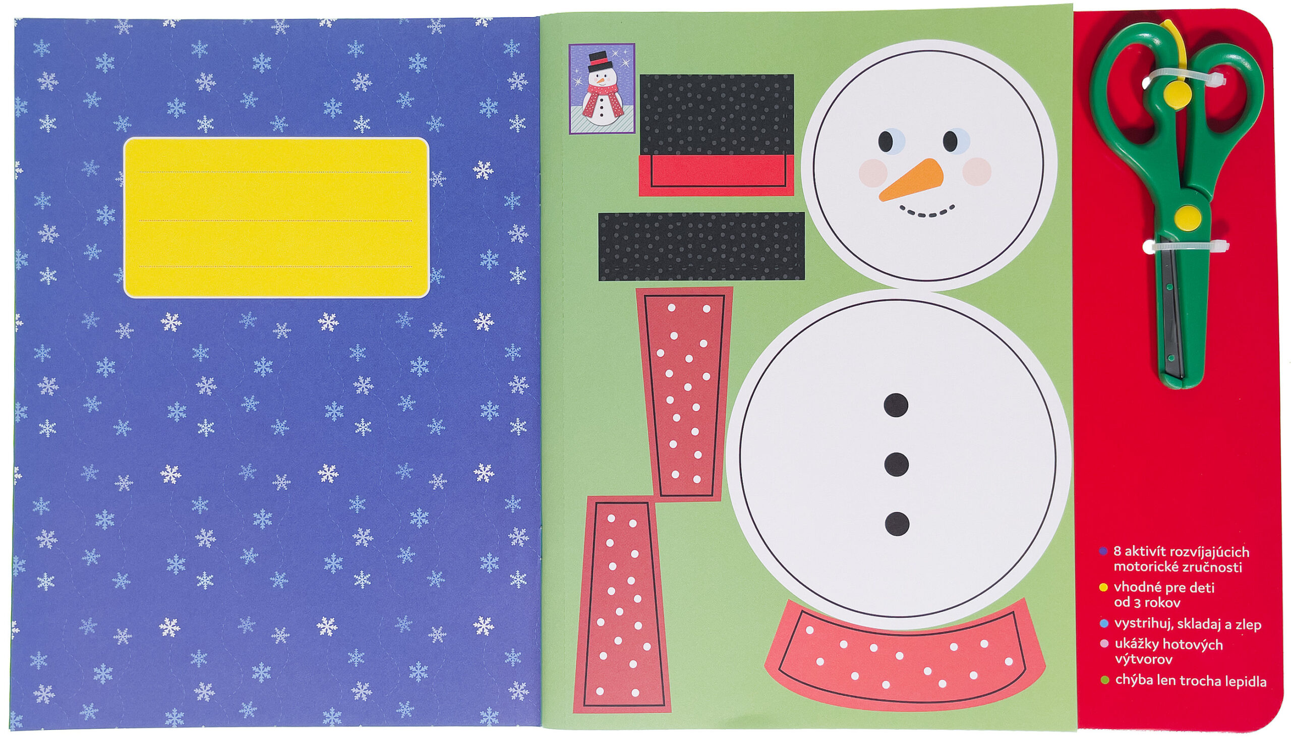 S týmto skvelým vianočným zošitom sa deti od 3 rokov učia, ako postupne strihať, skladať a lepiť jednoduché tvary, aby vytvorili trojrozmerné vianočné obrázky. Zoznámi sa s nožnicami, naučí sa ich držať a správne ich používať, pričom si precvičuje jemné motorické zručnosti. Zošit obsahuje detské nožnice a vo vnútri nájdete všetok potrebný papierový materiál. Stačí požiadať o pomoc lepidlo a zábavná vianočná tvorba môže začať!