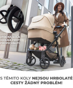 Newly je kočík s veľkými kolesami s tlmičmi. Sú odolné proti prepichnutiu a nemusíte ich dofukovať – sú ideálne na mestské aj lesné chodníky. Predné kolesá sa otáčajú o 360° a dajú sa zaaretovať pre jazdu rovno, takže kočík je vhodný aj do ťažkého terénu.