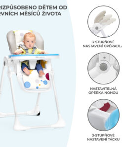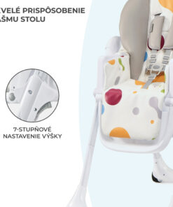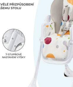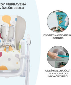 – Nastaviteľná tácka – umožňuje ľahko usadiť dieťa do stoličky a nastaviť vzdialenosť tácky do 3 polôh. S prídavným dvojitým podnosom sa ľahko čistí.