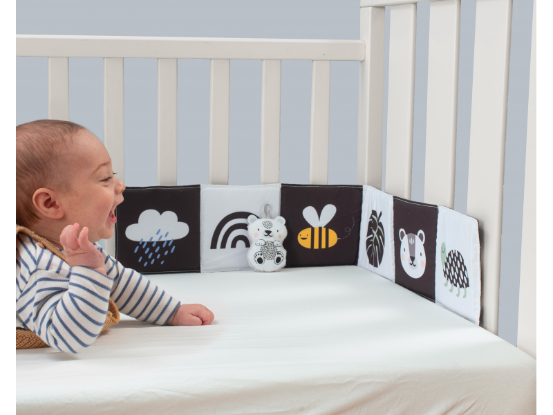 Knižka drží postavená samostatne alebo je možné ju pripevniť s pomocou úchytov na postieľku či do kočíka.