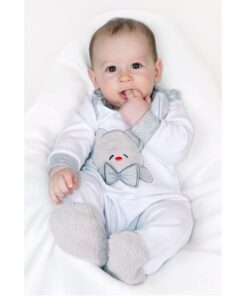 Originálne luxusné bavlnené dojčenské dupačky New Baby Honey Bear s 3D aplikáciou. Detské dupačky zdobí 3D obrázok medvedíka, krásny ozdobný lem okolo krčku a ramínku. Dupačky sú vyrobené z kvalitného materiálu. Dupačky majú zapínanie na cvočky na ramienku a medzi nožičkami. Zloženie: 100% bavlna.