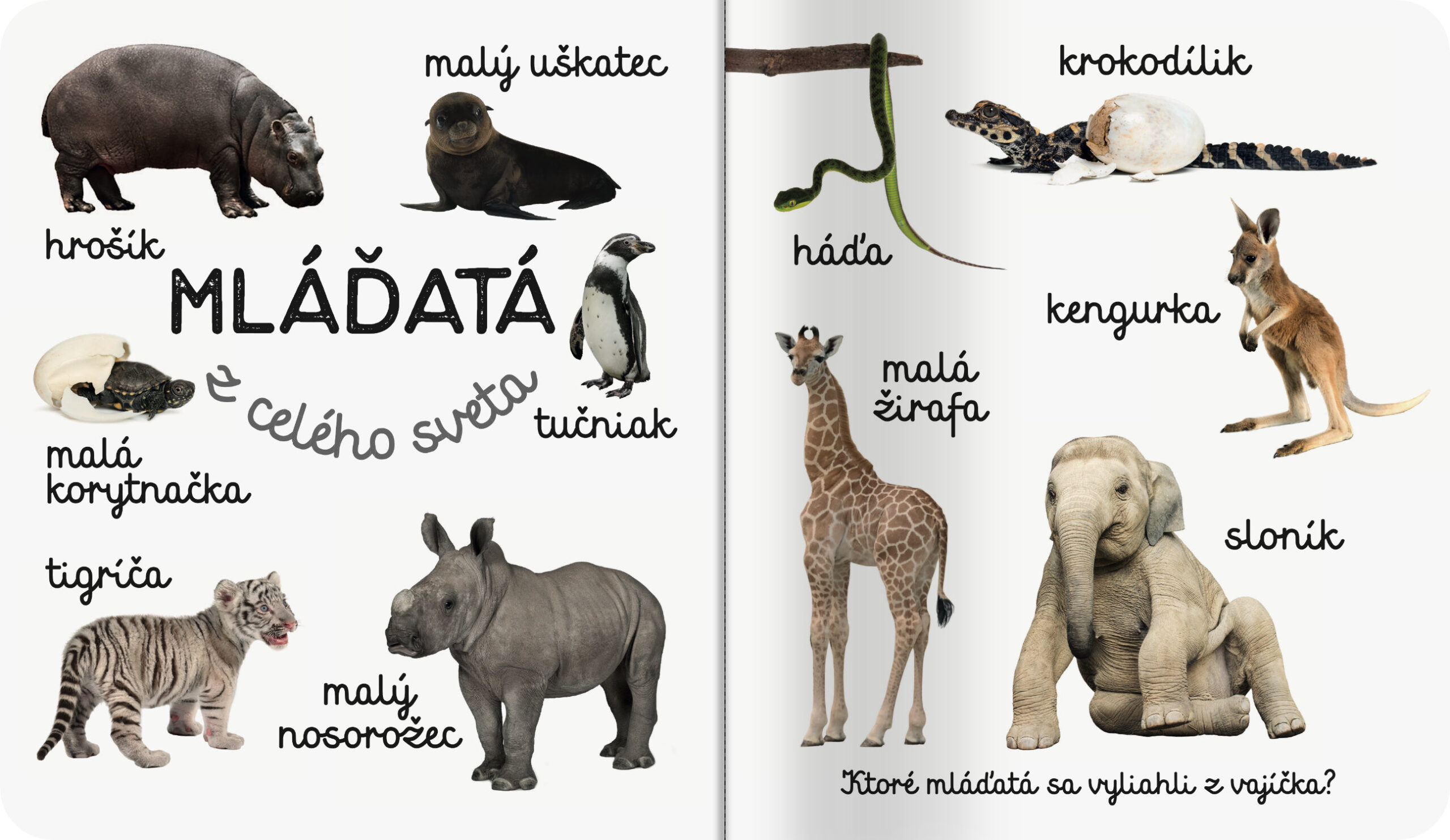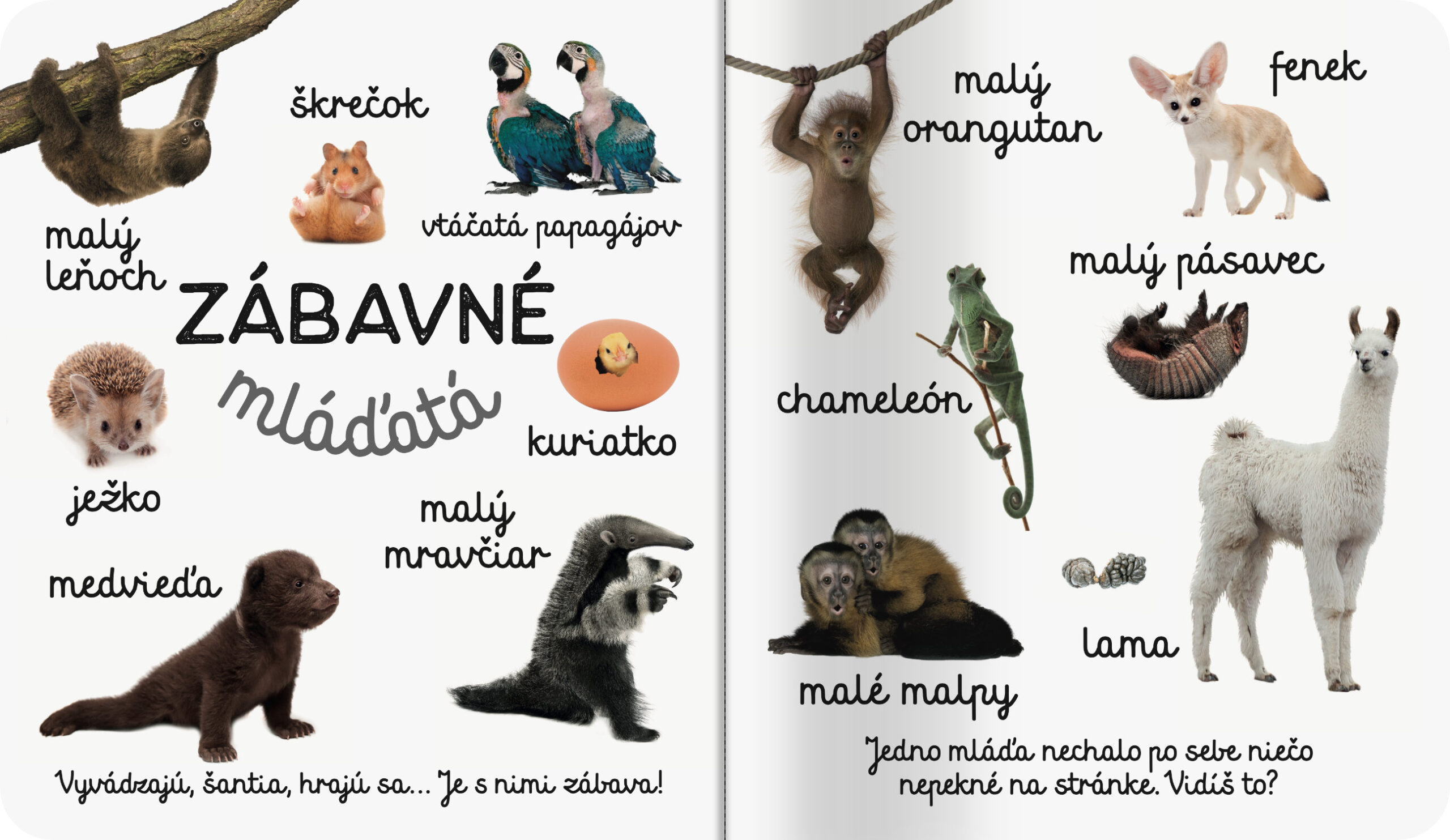 Toto leporelo pre najmenšie deti s pevnými stránkami je plné fotografií mláďat a zvierat z celého sveta. Veselé obrázky zvierat na bielom podklade zaujmú malé deti a otázky na konci stránky vzbudia záujem o zvieratá a ich život.