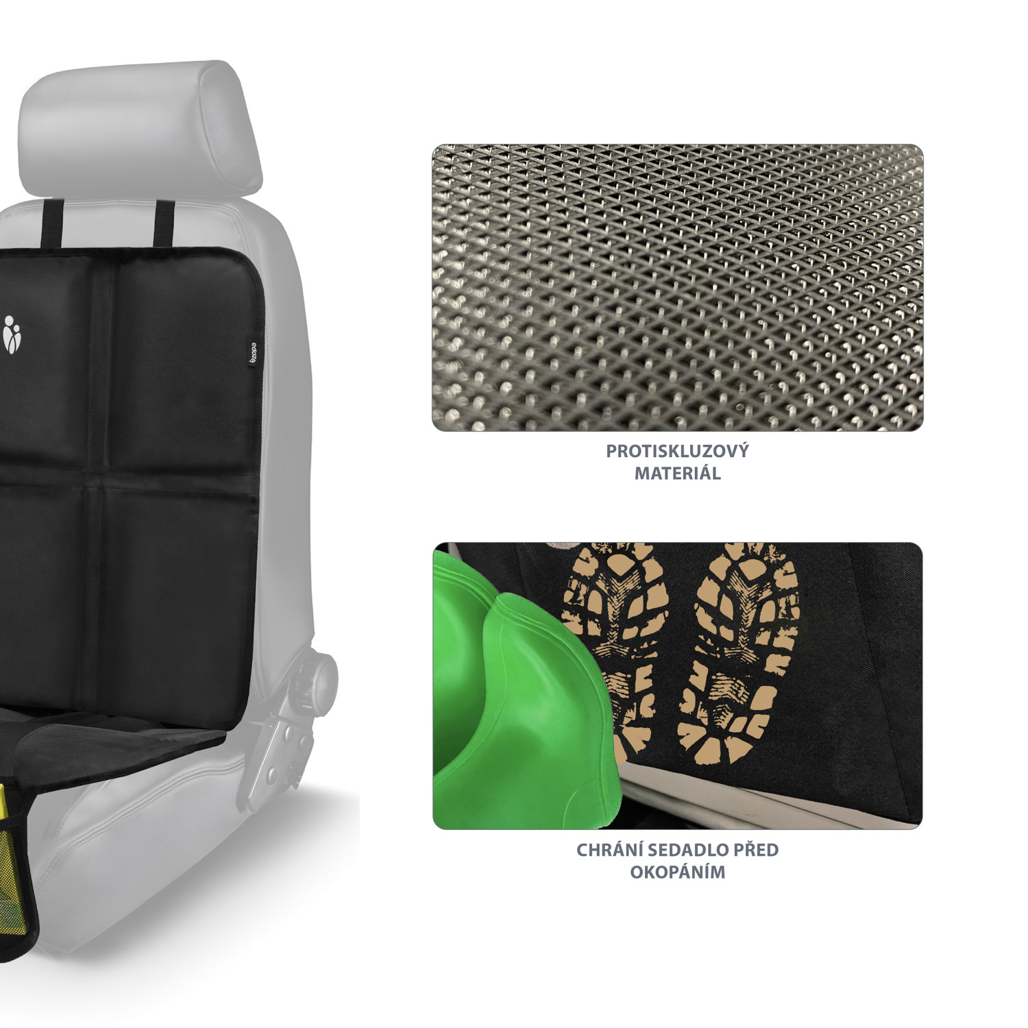 Praktická ochrana sedadlá pod autosedačku Zopa je užitočná pre každého rodiča, ktorý chce svoje auto udržať v čistote a ochrániť ho pred možným poškodením. Sedadlo autá chráni pred nechcenými škvrnami a rozliatymi tekutinami. Okrem praktickej funkcie plní aj užitočnú, sieťované vrecká v spodnej časti ochrany sedadlá sú vhodné pre uloženie hračiek, desiaty, či iných drobností, ktoré počas cesty dieťa využíva. Je vyrobená z odolného a umývateľného materiálu. Je dizajnovaná tak, aby sa zmestila medzi bezpečnostné pásy vozidla. Na sedadlo sa upevňuje pomocou praktického pásu na klip.