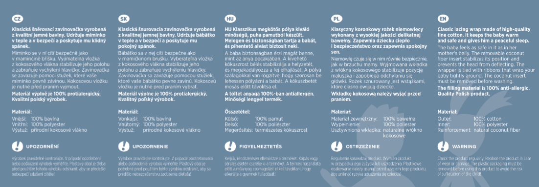 Bezpečné pohodlné prostredie pre bábätko, pre pocit ako v mamičkinom brušku. Udržuje bábätko v teple a v bezpečí a poskytuje mu pokojný spánok. Klasická šnurovacia zavinovačka je vyrobená z kvalitnej jemnej bavlny. Pevná vyberateľná vložka z kokosového vlákna stabilizuje jeho polohu a zabraňuje vychýleniu hlavičky. Rodičia, starí rodičia, či dospelí na návšteve sa tiež môžu cítiť istejšie pri manipulácii s malým telíčkom.