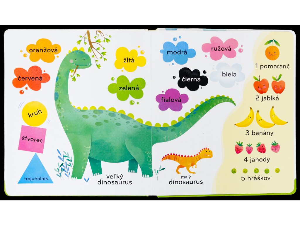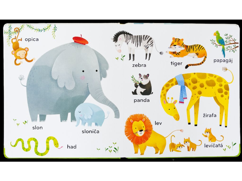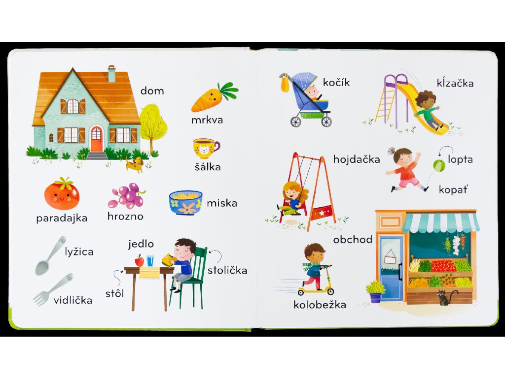 Táto knižka predstavuje báječný spôsob, ako si malé deti môžu rozširovať svoju slovnú zásobu. Na stránkach sa predstavujú tematické skupiny nových slovíčok, ktoré sú sprevádzané roztomilými ilustráciami, a tak si o nich môžu dospeláci spolu s deťmi rozprávať a užiť si spoločný čas čítania. Nájdete tu dopravné prostriedky, slovíčka o prírode a počasí, zvieratá hospodárske, vodné, exotické aj tie úplne najmenšie. Taktiež ľudské telo, činnosti, a dokonca aj rozprávkové bytosti.