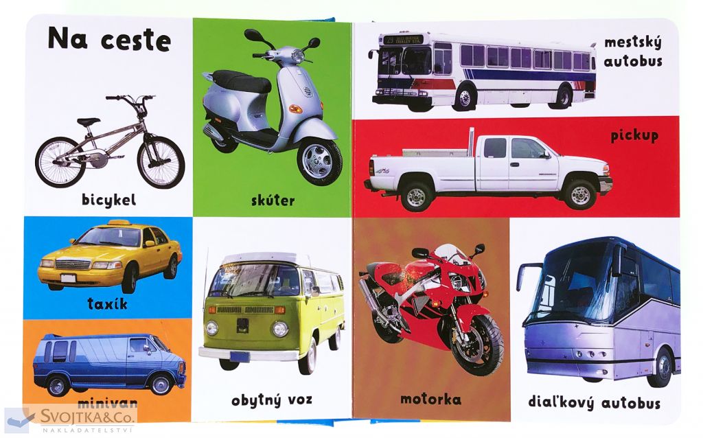 Fascinujú vaše dieťa nákladiaky na stavbe, traktory na poliach a rýchle motorky na cestách? Potom je táto knižka zameraná na rozvíjanie slovnej zásoby z oblasti dopravných prostriedkov určená práve im. Sto rôznych strojov – sto rôznych obrázkov s menovkami. Spolu s rozširovaním aktívnej slovnej zásoby si v nej deti precvičia aj farby (červené, alebo modré auto?) A protiklady (malé, alebo veľké auto?). v tejto veselej knižke nájdete nákladiaky, vlaky, autá, lietadlá a vôbec všetky dopravné prostriedky, čo sa pohybujú. Vďaka mäkkej