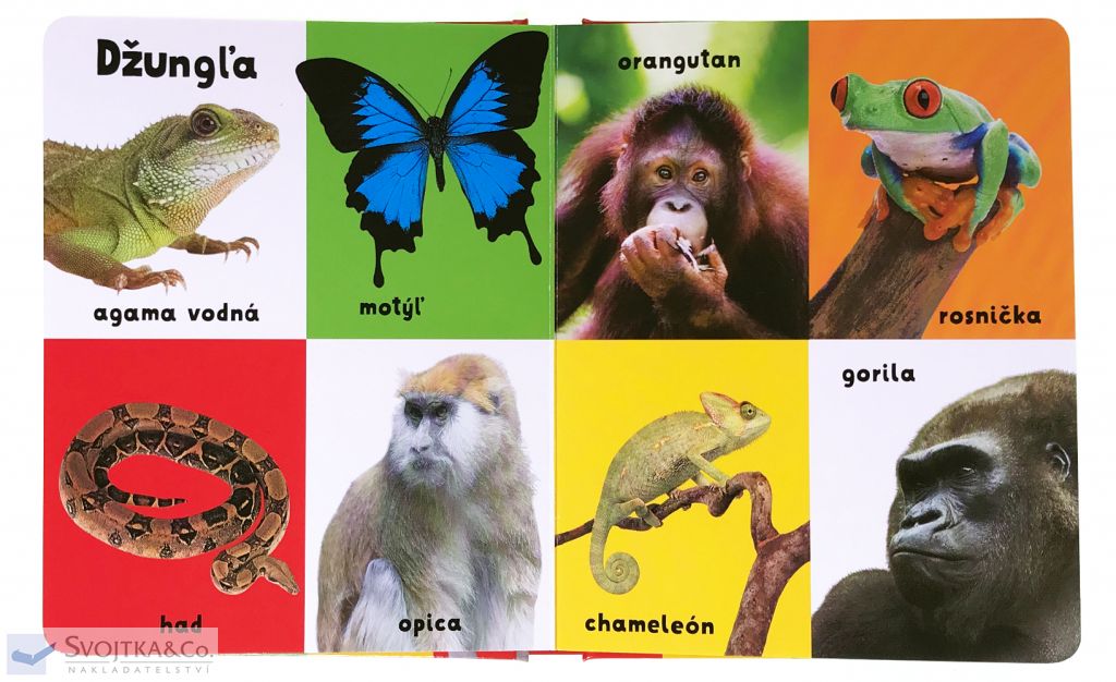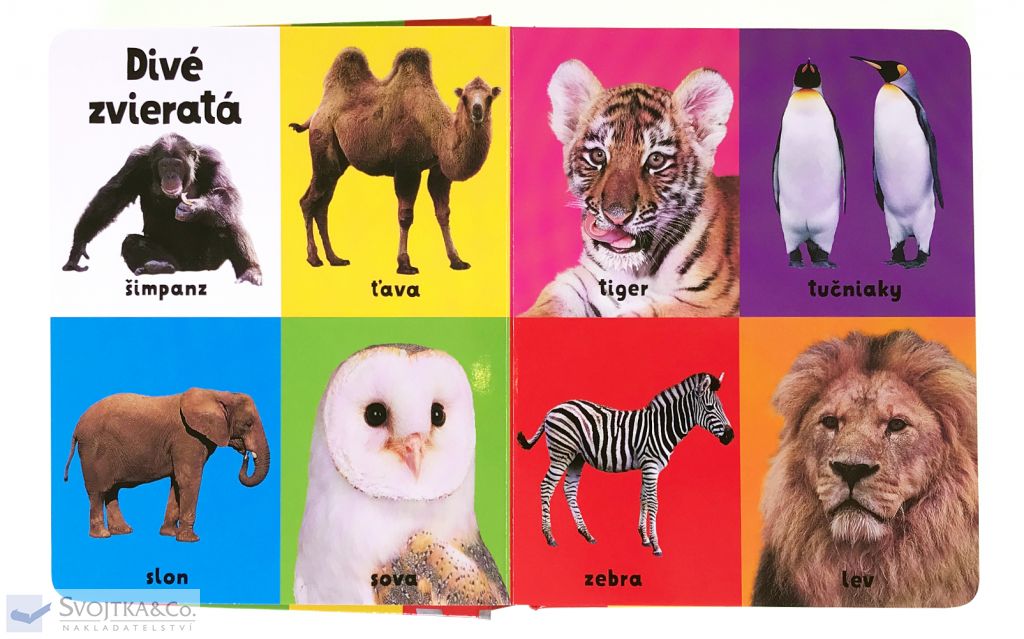 V tejto knižke určenej tým najmenším „čitateľom“, ale predovšetkým ich rodičom, ktorí majú záujem o rozvíjanie slovnej zásoby svojich detí, je predstavených 100 zvierat na farebných fotografiách s menovkami. Mäkká obálka a zaoblené rohy umožňujú vašim ratolestiam pustiť sa náruživo do „čítania“ bez toho, aby ste sa museli obávať o bezpečnosť detí, či stav knihy. Na stránkach nájdete prehľadne roztriedené názvy zvierat podľa niekoľkých kategórií domáci maznáčikovia, polárne zvieratá, zvieratá žijúce v džungli a iné. Kto to bučí a mečí na statku? Pozri, kto sa to schováva v lese? Naučte deti rozpoznávať aj zvieratá zo vzdialenejších kontinentov Afriky a Austrálie. V knižke nájdete zvieratá veľké (slon, medveď, žirafa), ale i tie najmenšie chrobáky a hmyz.