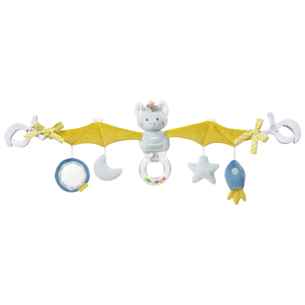 Reťaz v tvare netopiera s roztiahnutými krídlami. Na konci krídel sú mašličky na ozdobu a pevné klipsy na pripevnenie. Uprostred reťaze pod telom netopiera je hrkálka, ktoré sa dobre drží a obsahuje guličky v dúhových farbách. Pod každým krídlom sú závesy, na ktorých sú upevnené hračky. Zrkadielko, pískacie hviezdička, rachotiace raketka a pol mesiac vydávajúce šuštivý zvuk. Reťaz je nápaditý a dokáže deti zabaviť.