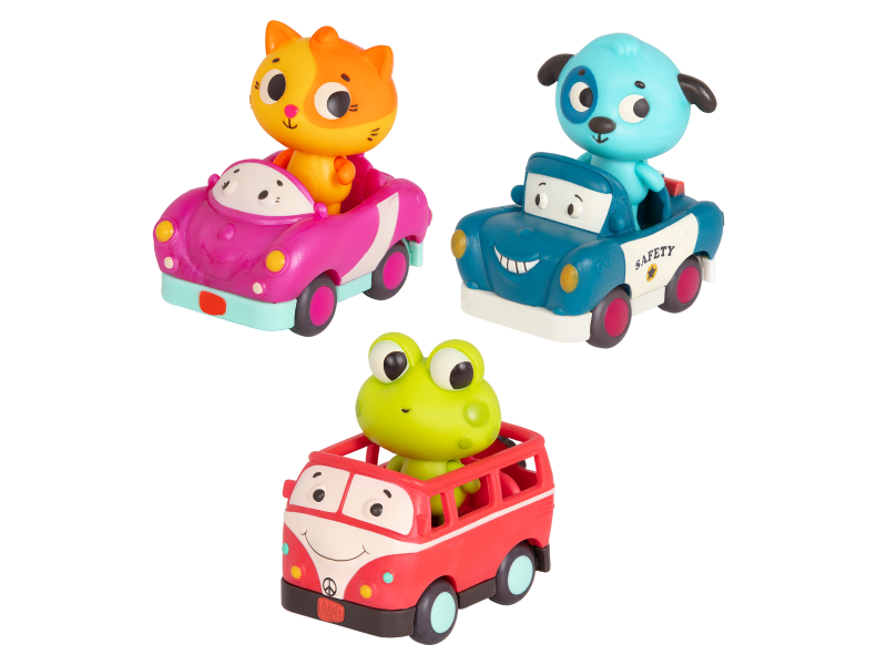 Veselé autíčka pre najmenších majú roztomilé vodičov v podobe mačičky, psíka a žabky. Zvieratká sú vyberateľné a môžu si autá, ktoré riadia, vymieňať! Po stlačení zvieratka usadeného v aute sa ozvú zvuky a autíčko svieti.