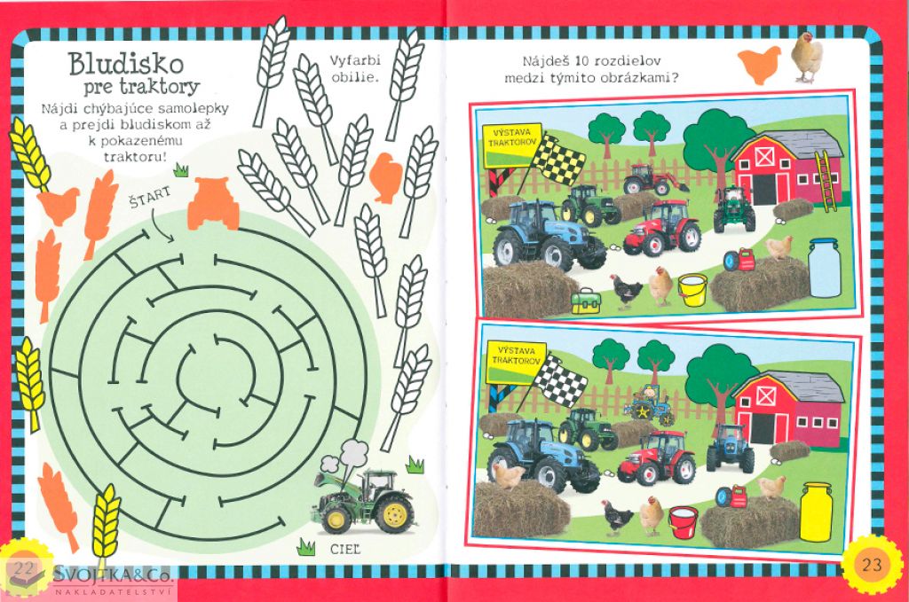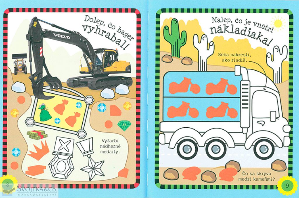 Nalep autá na kamión. Vyfarbi traktor svojimi obľúbenými farbami. Dolep samolepky toho, čo vyhrabal bager. Zistíš, ktorý z traktorov dôjde najskôr do cieľa? Nájdi v kontajneri šesť predmetov… Zabávaj sa pri množstve činností spojených s vyfarbovaním, doplňovaním a nalepovaním viac ako 1 000 samolepiek do tejto knižky plnej traktorov a nákladiakov, ktoré si môžeš nalepiť buď priamo do tejto knihy, alebo kamkoľvek budeš chcieť!