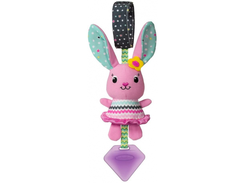 Ružový králiček ponúka rôznorodé textúry na skúmanie a hryzátko, ktoré pomáha dieťaťu pri prerezávaní prvých zúbkov. Pri pohybe jemne cinká.