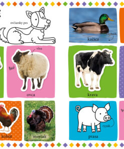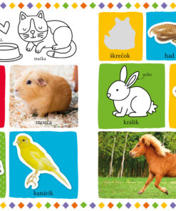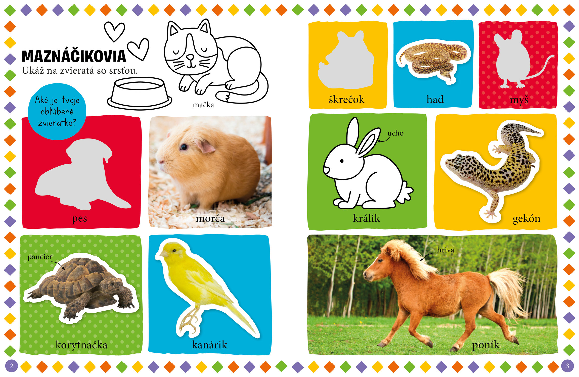 Výrazné obrázky a fotografie zvierat vo farebných rámčekoch s popismi predstavia deťom 100 prvých slov zvierat, vrátane vtákov, domácich maznáčikov a divokých zvierat. Pri vyfarbovaní obrázkov a lepení samolepiek sa dieťa hravou a interaktívnou formou zoznámi so zvieratami a naučí sa niečo nové. Kniha pomáha rozvíjať slovnú zásobu, zlepšuje koordináciu oka a ruky a je vhodná pre deti od 3 rokov.